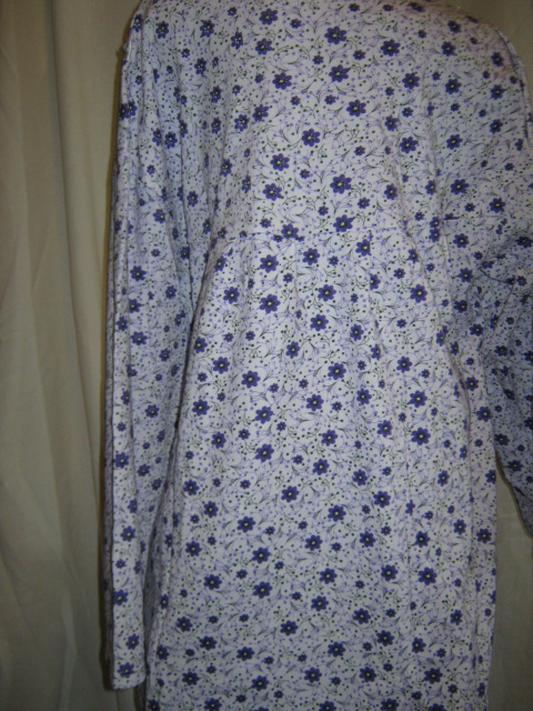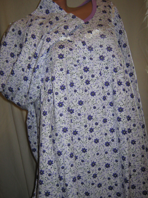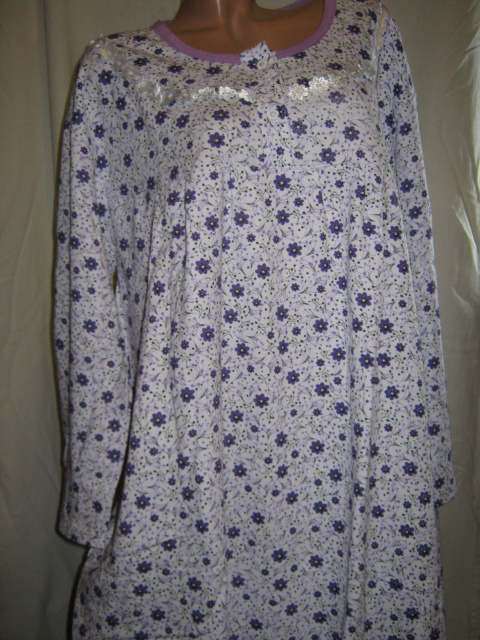 Жіноча супербатальна нічна сорочка Best, чиста 100% бавовна, виробництво Узбекистан, на білому тлі фіолетові квіти, рукав 3/4, утеплена, всередині з начосом, спереду півколом аплікація з білих квітів, застібається на 2 ґудзики, під грудьми і ззаду складки, вільний крій, зручна і практична як в носінні, так і в пранні. Дуже хороша повітропроникна тканина, м'яка і приємна до тіла. Підходить алергікам.