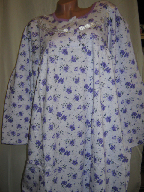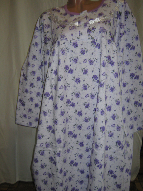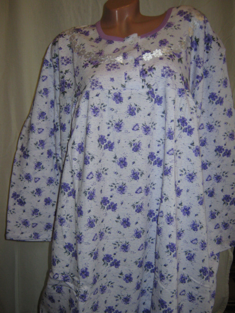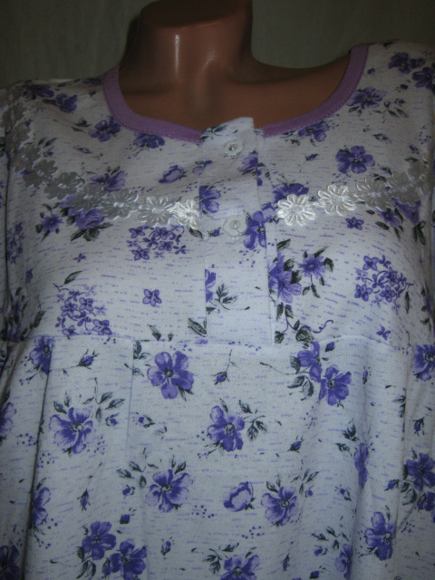 Жіноча супербатальна нічна сорочка Best, чиста 100% бавовна, виробництво Узбекистан, на білому тлі фіолетові квіти, рукав 3/4, утеплена, всередині з начосом, спереду півколом аплікація з білих квітів, застібається на 2 ґудзики, під грудьми і ззаду складки, вільний крій, зручна і практична як в носінні, так і в пранні. Дуже хороша повітропроникна тканина, м'яка і приємна до тіла. Підходить алергікам.