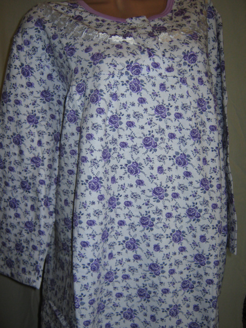 Жіноча супербатальна нічна сорочка Best, чиста 100% бавовна, виробництво Узбекистан, на білому тлі фіолетові квіти, рукав 3/4, утеплена, всередині з начосом, спереду півколом аплікація з білих квітів, застібається на 2 ґудзики, під грудьми і ззаду складки, вільний крій, зручна і практична як в носінні, так і в пранні. Дуже хороша повітропроникна тканина, м'яка і приємна до тіла. Підходить алергікам.