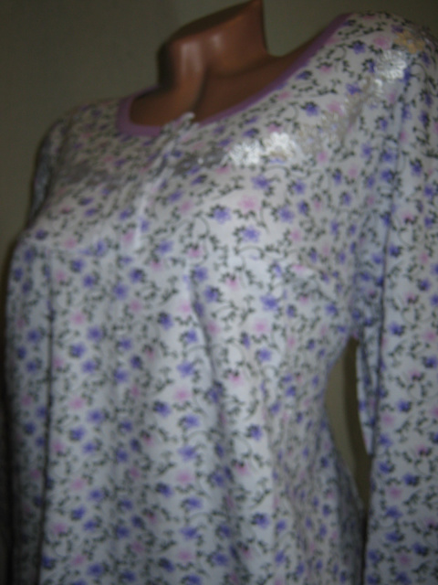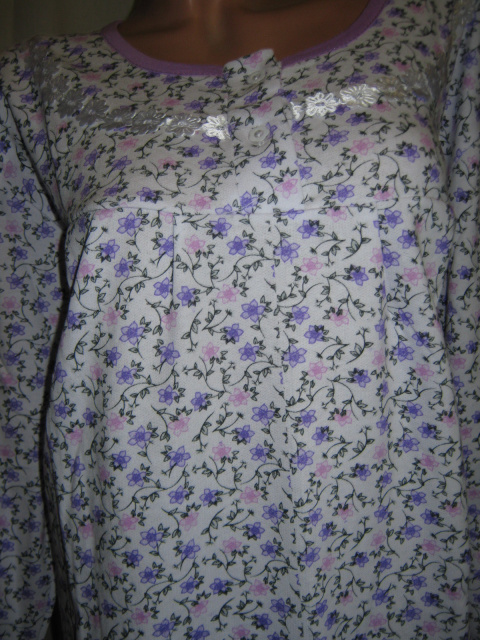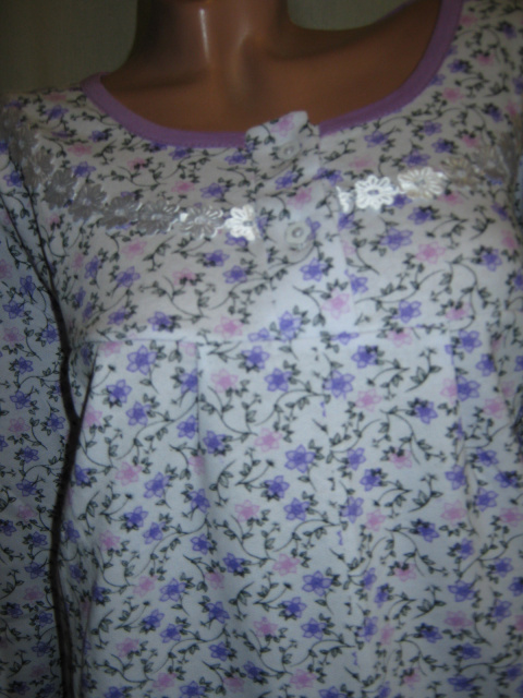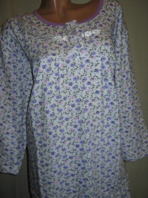 Жіноча нічна сорочка Best, чиста 100% бавовна, виробництво Узбекистан, на білому тлі бузкові квіти, рукав 3/4, утеплена, всередині з начосом, спереду півколом аплікація з білих квітів, застібається на 2 ґудзики, під грудьми і ззаду складки, вільний крій, зручна і практична як в носінні, так і в пранні. Дуже хороша повітропроникна тканина, м'яка і приємна до тіла. Підходить алергікам.