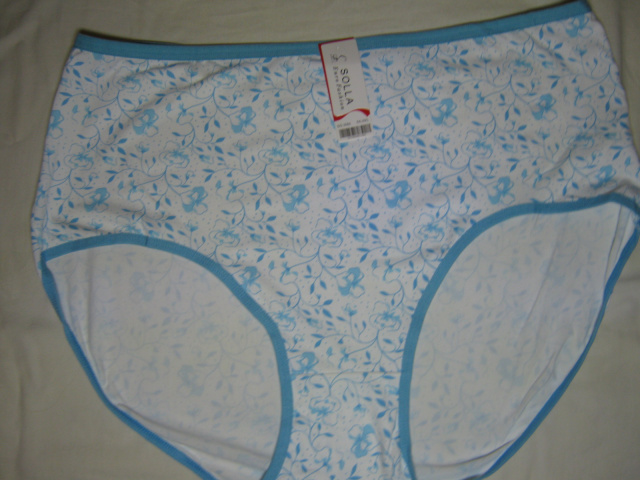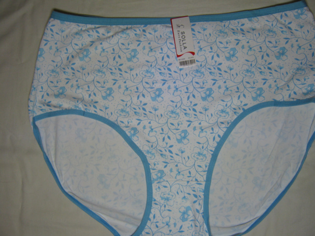 Жіночі трусики супербатали Solla, бамбукова тканина, на білому тлі блакитні малюнки - гілочки, квіти, по всьому виробу, навколо ніжки і по верху гумки-окантовки в тон (все, як на фото). Розмір у наявності візуально у розтягнутому вигляді тільки 64-66 (вказано розмір 5XL/6XL - універсальний).